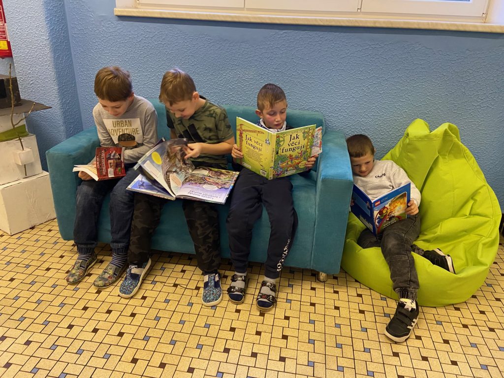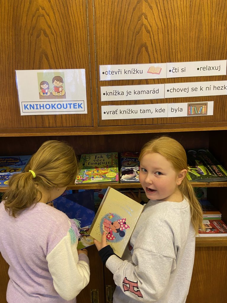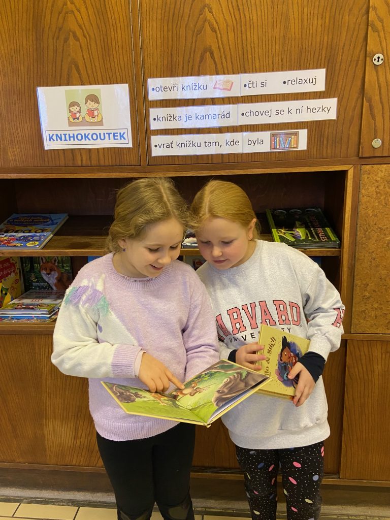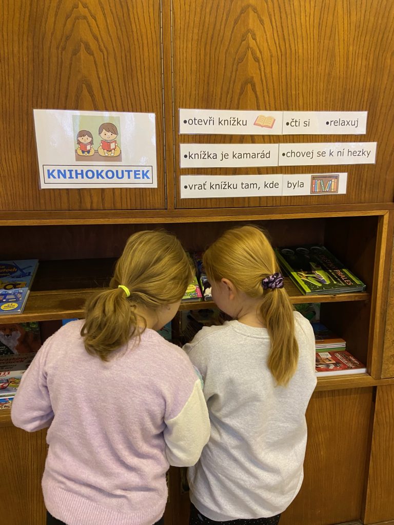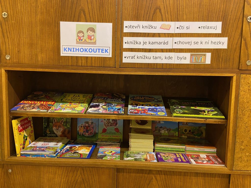 Na školní chodbě 1. stupně se objevilo něco nového. Je to KNIHOKOUTEK. Děti si v něm můžou o přestávce půjčit knížku, sednout si na vaky a číst si, prohlížet, listovat, … Objevování se meze nekladou.