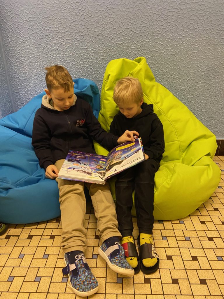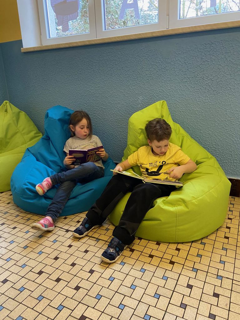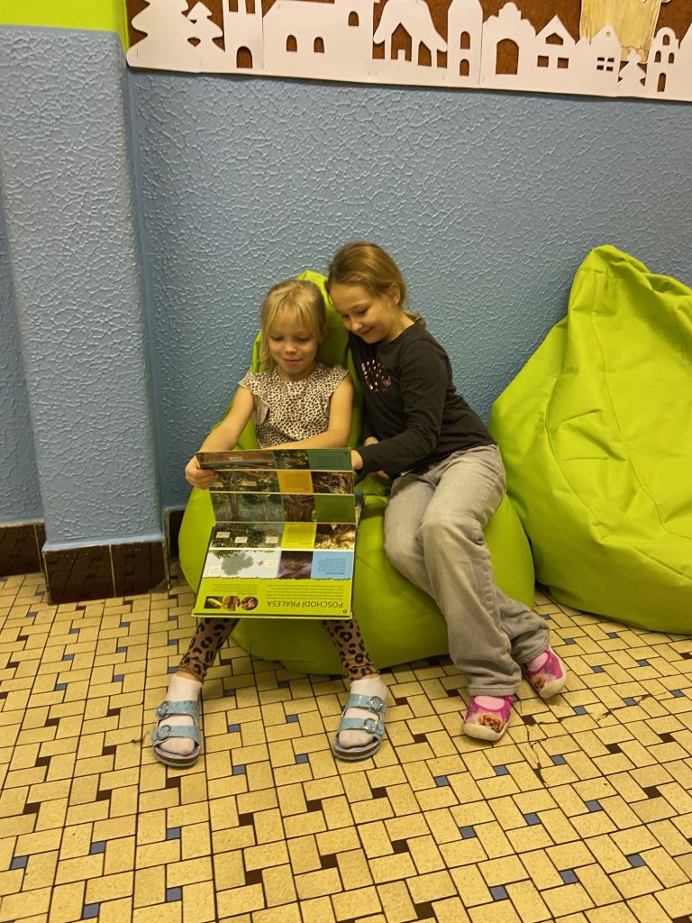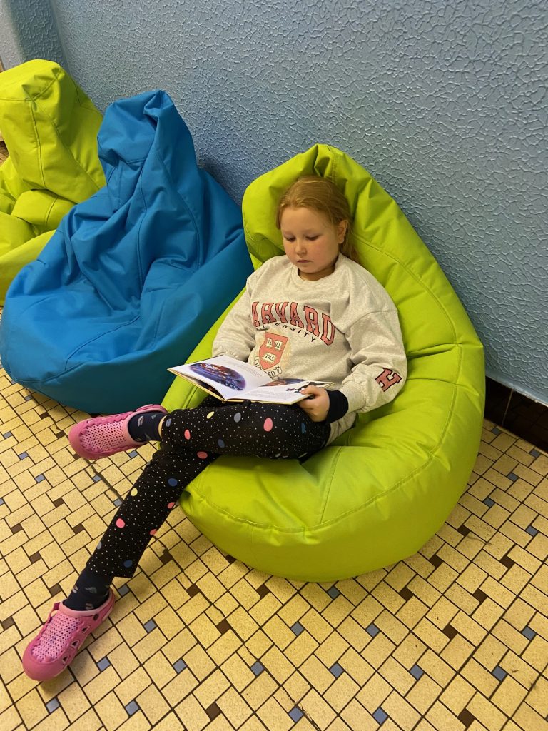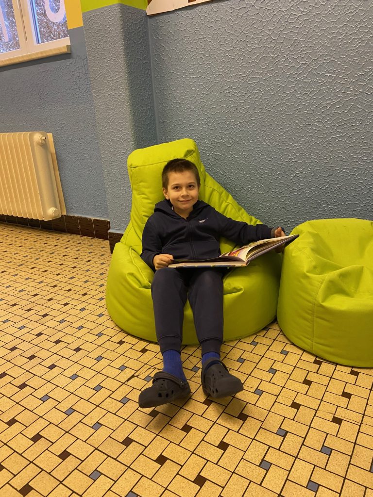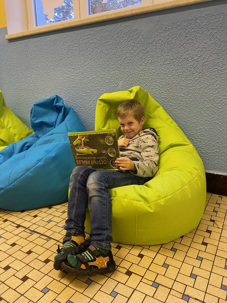 Na školní chodbě 1. stupně se objevilo něco nového. Je to KNIHOKOUTEK. Děti si v něm můžou o přestávce půjčit knížku, sednout si na vaky a číst si, prohlížet, listovat, … Objevování se meze nekladou.